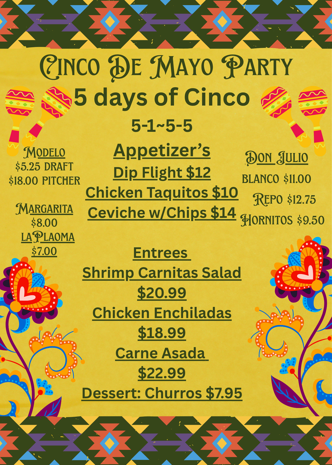 Come in everyday May 1st to May 5th and try a new food and drink special each day of the celebration. We can’t wait to see you!