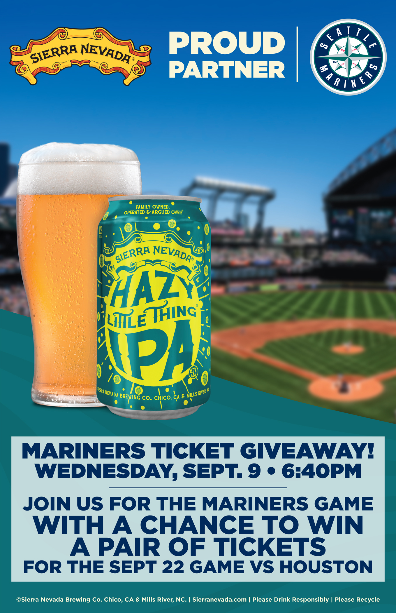 Come in and join us at The Spot Tavern in Renton September 9th for the M’s Vs. the Texas Rangers – AND your chance at giveaways for Sierra Nevada swag. PLUS the chance to win a pair of M’s Game Tickets for the September 22nd Game Vs. the Huston Astros.